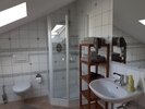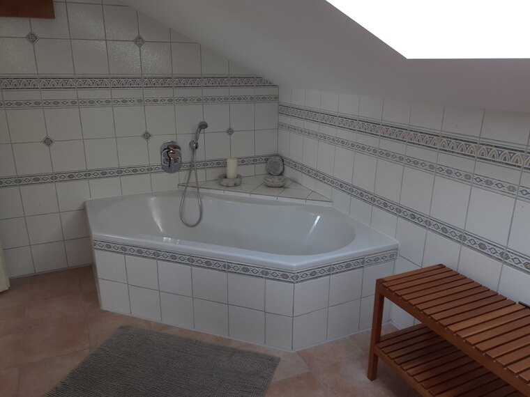 Ohne Dachschräge gemessen 80qm große Ferienwohnung im zweiten Stock (Dachgeschoss), voll ausgestattete Küche mit Spülmaschine, Sat-TV, Bad mit Dusche und Badewanne. Im 1. Schlafzimmer befindet sich ein Doppelbett, Im 2. Schlafzimmer befinden sich zwei Einzelbetten und ein Kinderbett ( bis ca. 2 Jahre). Ein weiteres Kinderbett bis ca. 2 Jahren kann noch bereitgestellt werden. Im Wohnzimmer befindet sich noch ein Doppelbett und ein Kaminofen. Eigener kleiner Balkon. Ganze Wohnung mit Fussbodenheizung. W-Lan vorhanden.